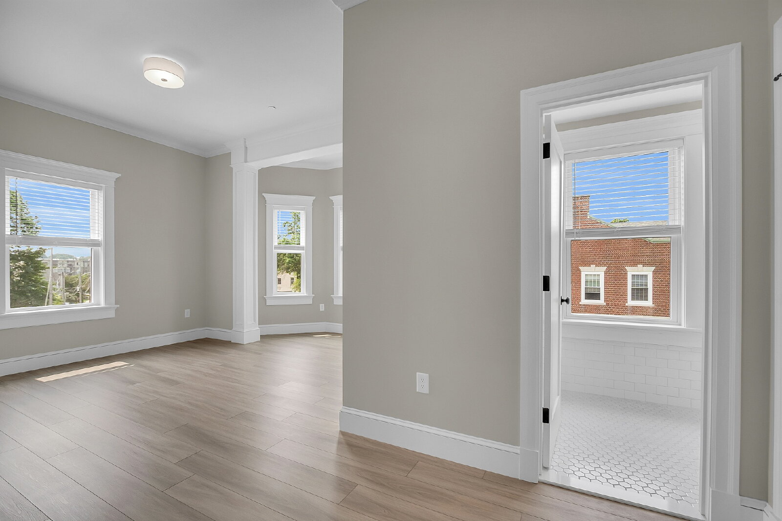 Gourmet kitchen opens up to the large, sun-drenched living room with tiled gas fireplace and bay windows. All stainless steel appliances, extra long stone counter with seating for 4+, and custom cabinetry. High-end finishes & details throughout plus over 10' ceilings and in-unit laundry. The primary suite is expansive with a tiled primary bathroom and sunny sitting area by the bay window that could also be used for office space. The full bathroom with marble walls and floors is across from the large guest bedroom, which has double closets. Private covered deck with overhead lights off the kitchen. Video doorbell system, Nest thermostat, central air, & natural gas heat.